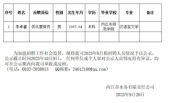 內(nèi)江市水務(wù)有限責(zé)任公司2023年9月擬招聘人員公示