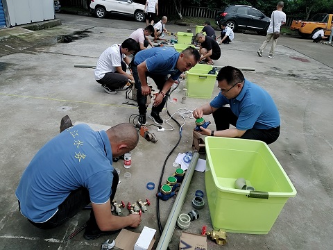 7月20日下午,二水廠維修車間門前,來自市水務(wù)公司管網(wǎng)運(yùn)行部、鄉(xiāng)鎮(zhèn)供水部的11支隊(duì)伍22名技能好手,正在緊張進(jìn)行著搶維修實(shí)操比賽:有的正認(rèn)真識(shí)別設(shè)計(jì)圖;有的正在切割水管,熔合管道;有的已經(jīng)開始組裝管道、閥門......一個(gè)個(gè)全神貫注,顧不上汗水模糊了眼睛,浸濕了衣裳。這是公司開展搶維修技能競賽上實(shí)際操作環(huán)節(jié)的一個(gè)場景。