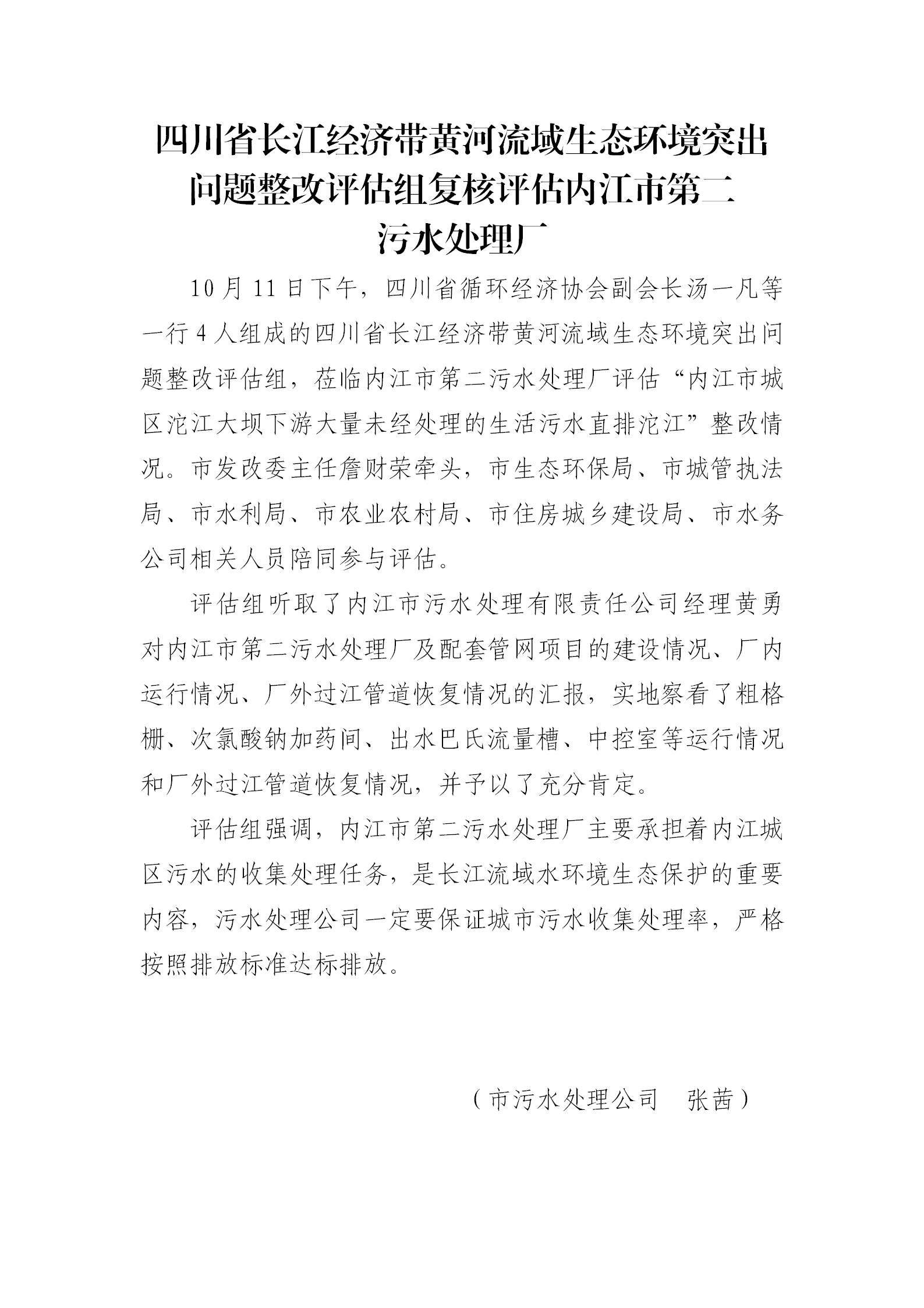 四川省長江經濟帶黃河流域生態環境突出問題整改評估組復核評估內江市第二 污水處理廠