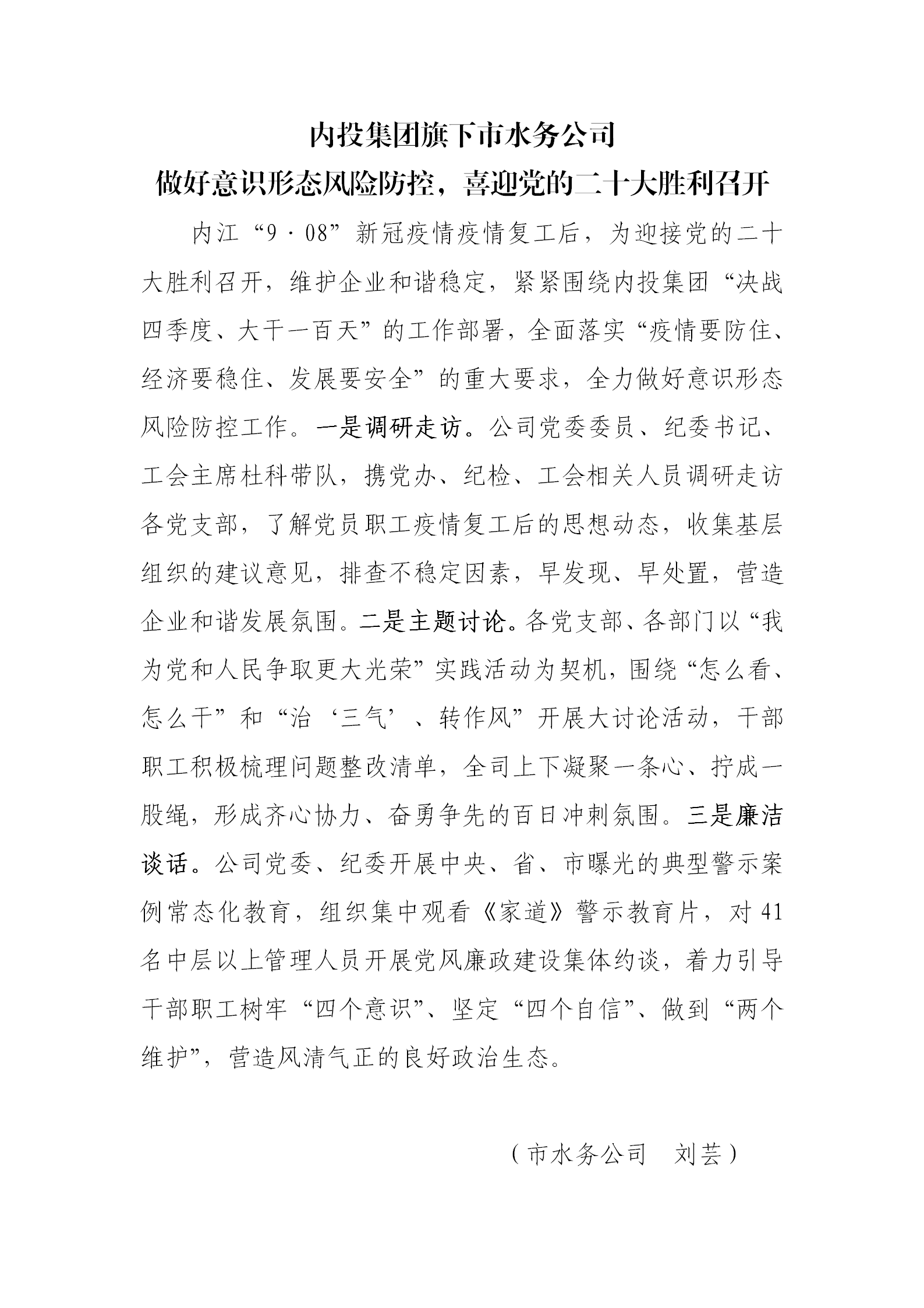 內(nèi)投集團(tuán)旗下市水務(wù)公司 做好意識(shí)形態(tài)風(fēng)險(xiǎn)防控,喜迎黨的二十大勝利召開(kāi)